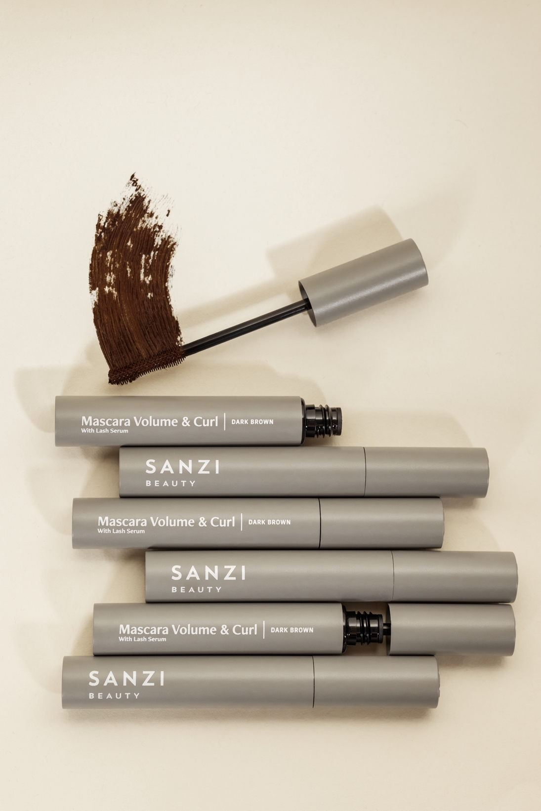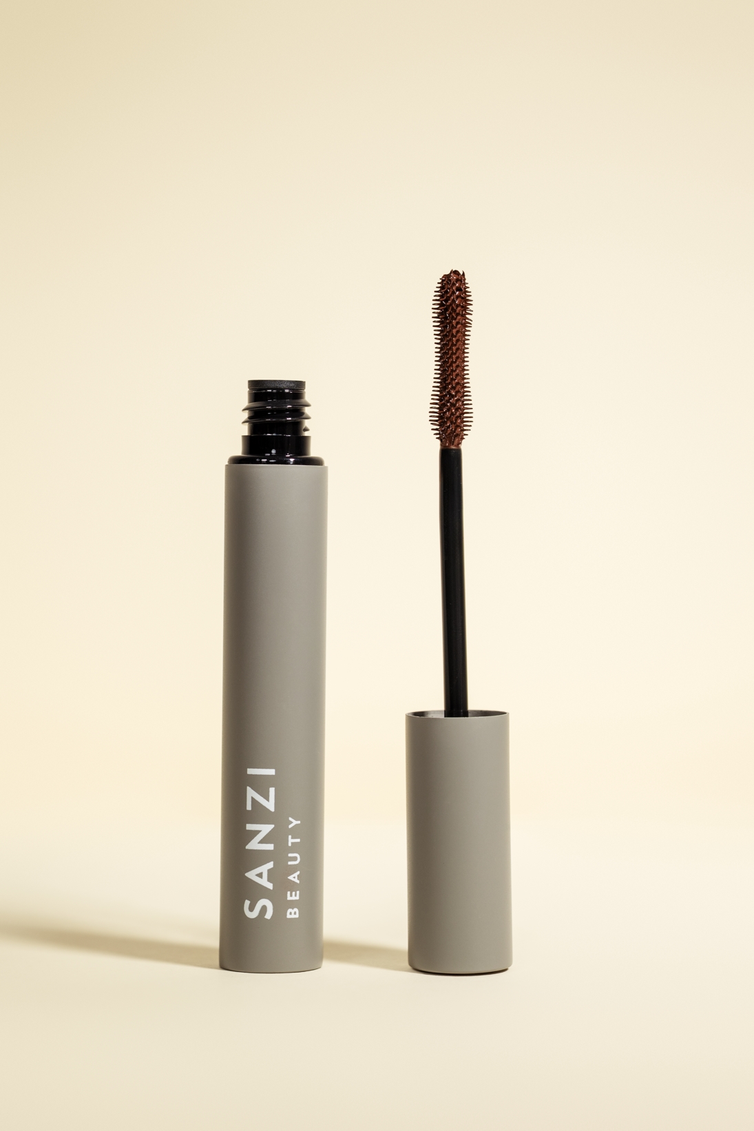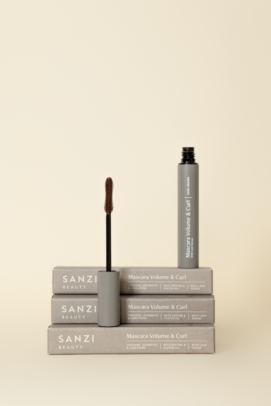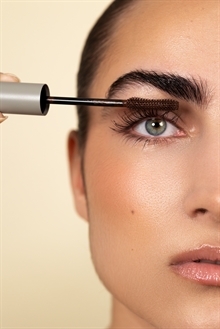 Sanzi Beauty brun mascara der giver dine vipper en volumenlook og et smukt buk, med indbygget vækstfremmende peptid.